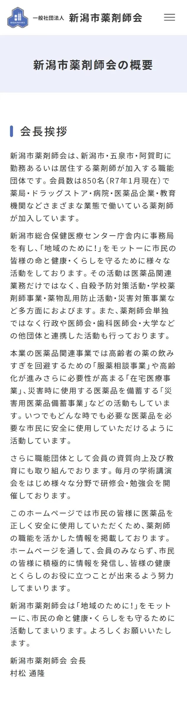 | 営業品目 | 一般社団法人 新潟市薬剤師会は、会員の職能の学術的及び倫理的水準を高め、薬学及び薬業の進歩発達を図り、市民の皆様の健康、保健、福祉の向上・推進に寄与することを目的とするため以下の事業を行います。