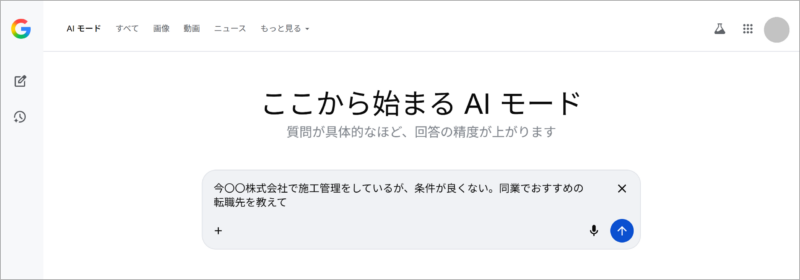 AIモードでの検索例。Google検索と違い、AI相手だと「ふわっとした」相談もしやすいのが魅力。