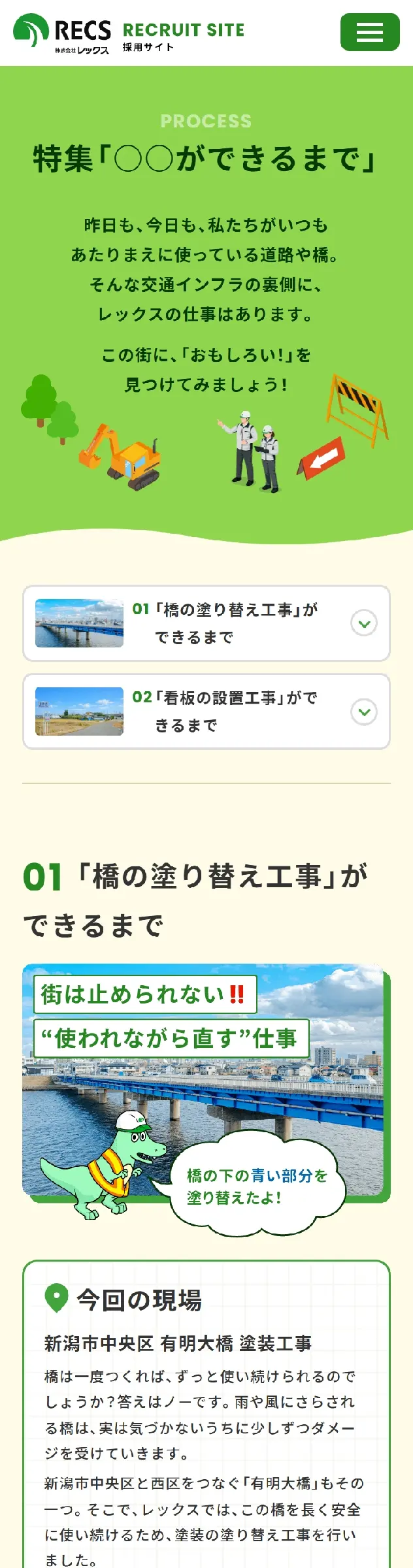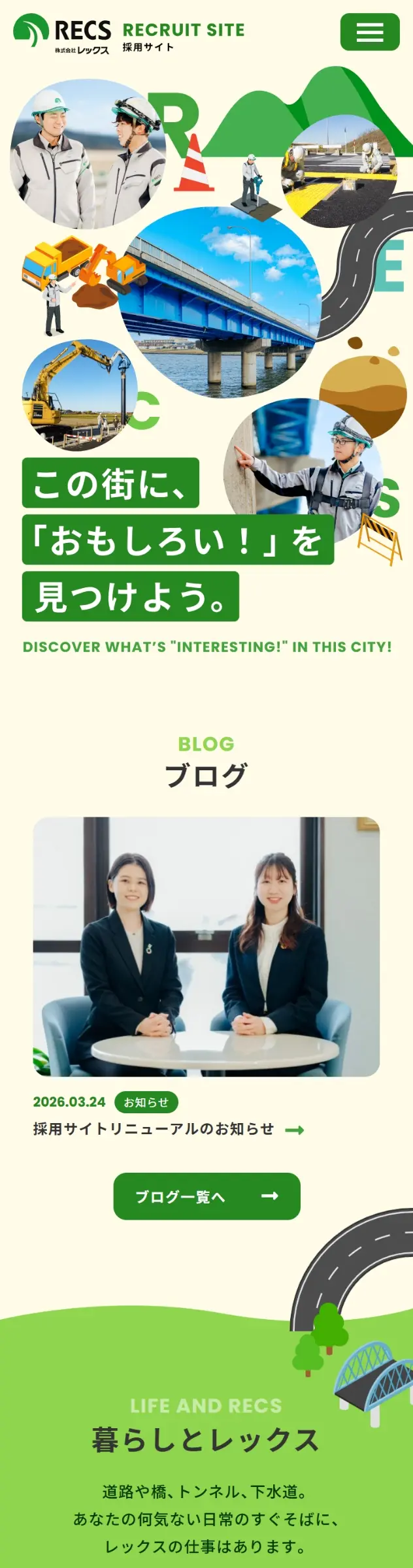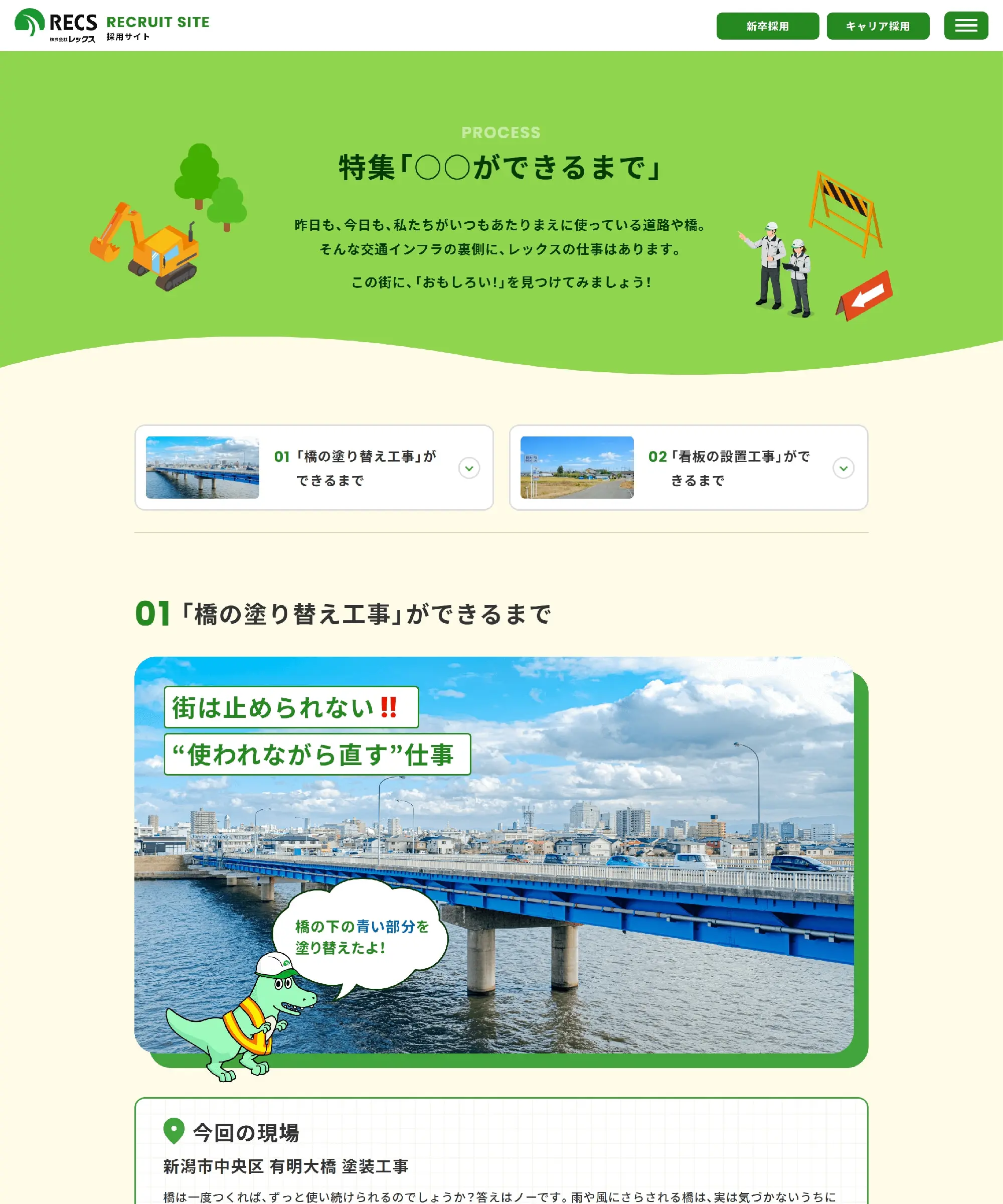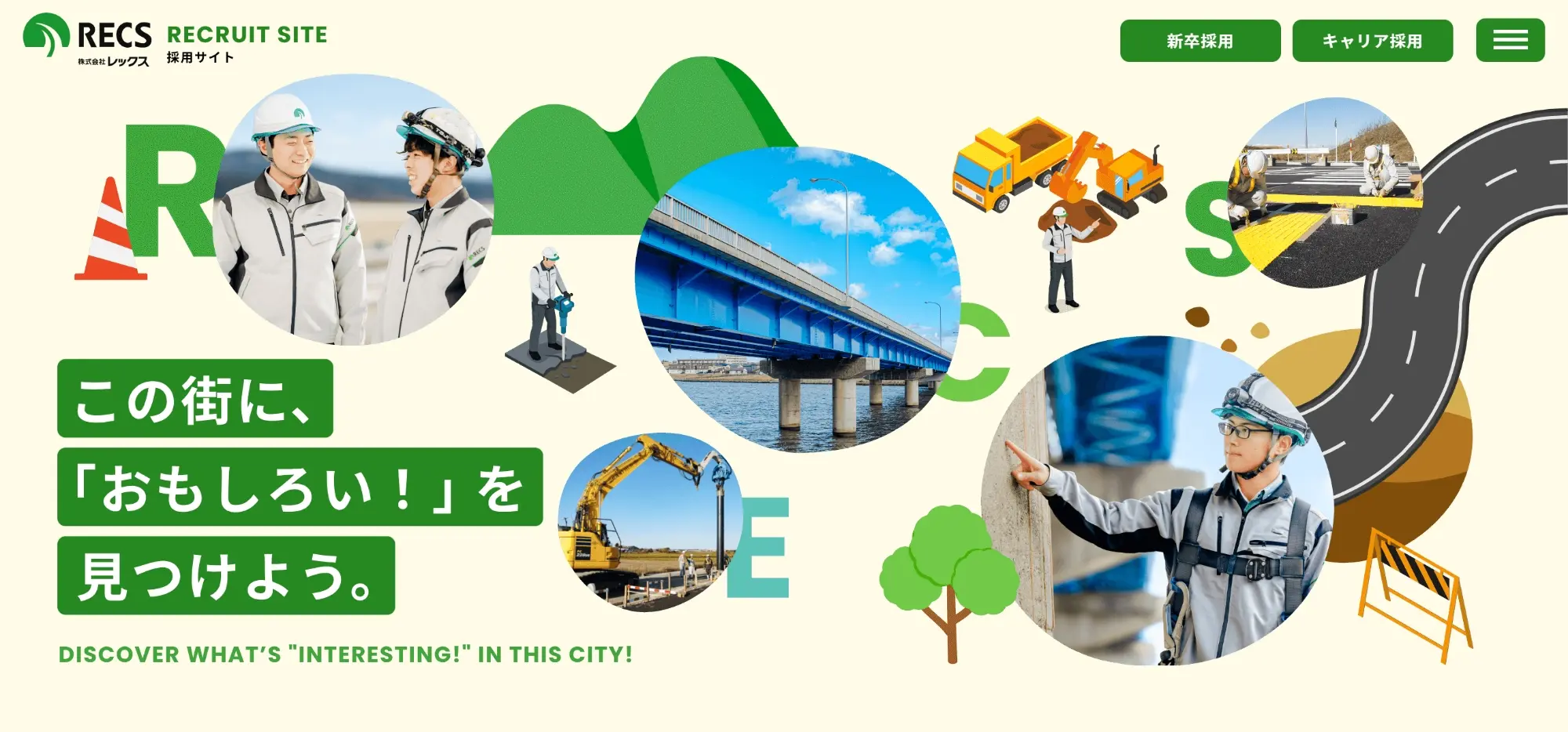 - 道路や橋を支える仕事のイラストを取り入れ、土木らしさを表現。また、身近な暮らしの中でレックス様の仕事を感じられる表現としています。