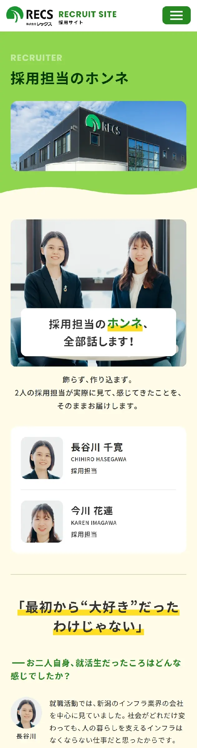 - 学生へのメッセージとして、採用担当者様の本音トークを掲載。また、「先輩が会社を紹介してくれる」というコンセプトのもと、社員インタビューコンテンツを作成しました。